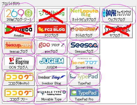 hpbでブログの設定を行うために、出てくるブログサイトで利用できるサイトは以下の通り